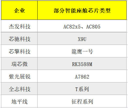 在国内智能汽车行业快速发展的同时,涌现出一批优秀的芯片企业。智能座舱芯片的新领域,也引来国内多家企业的布局,除了传统电子企业、消费电子企业。国内进入该赛道的企业包括紫光展锐、地平线、杰发科技、芯驰科技、全志科技、瑞芯微等。