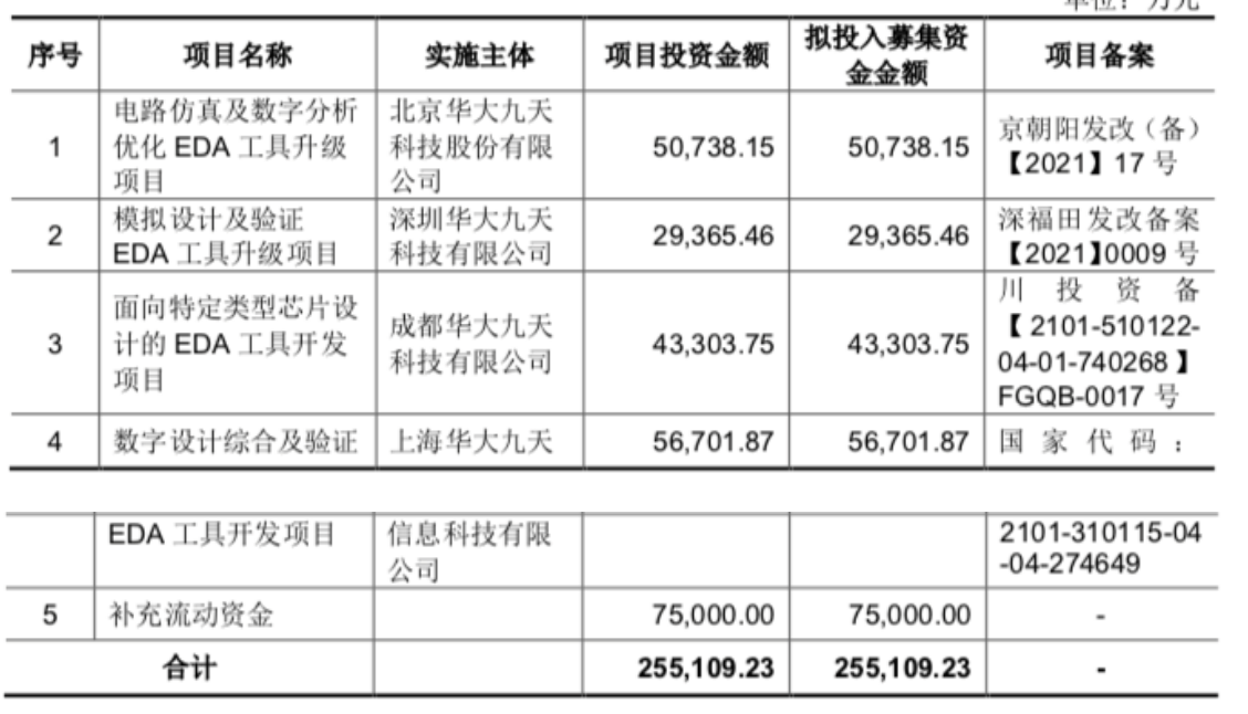 华大九天拟公开发行股票108,588,354股,占发行后公司总股本的比例为20%,公开发行股票所募集的资金扣除发行费用后,将主要投向电路仿真及数字分析优化EDA工具升级项目、模拟设计及验证EDA工具升级项目、面向特定类型芯片设计的EDA工具开发项目、数字设计综合及验证、EDA开发项目等。