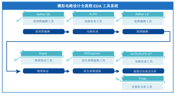 华大九天是目前国内唯一能够提供模拟电路设计全流程EDA工具系统的本土EDA企业。 该系统包括原理图编辑工具、版图编辑工具、电路仿真工具、物理验证工具、寄生参数提取工具和可靠性分析工具等,为用户提供了从电路到版图、从设计到验证的一站式完整解决方案。