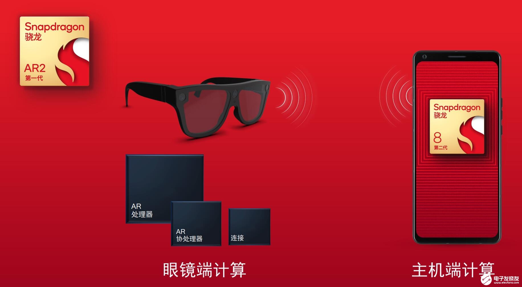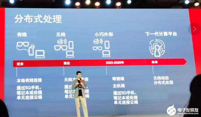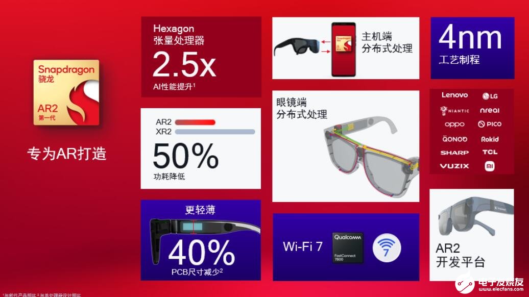 郭鹏介绍,新一代AR2平台采用开创性的多芯片架构(包括AR主处理器、AR协处理器、连接芯片共计三个芯片)和分布式技术,分布式技术将运算分布到手机和眼镜,使得功耗降低50%,AI性能提升2.5倍,从而赋能小巧轻薄的高性能AR眼镜。它依赖第二代骁龙8平台的手机,可以做更多内容和画面的渲染。