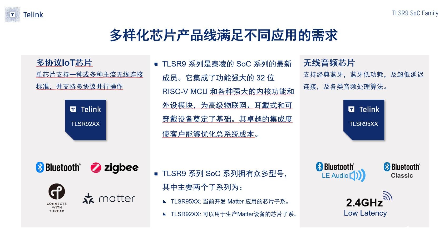 12月2日,在Matter中国区开发者大会上,泰凌微电子应用开发工程师纪瀛灏表示,TLSR9系列SoC是泰凌微电子拥抱RISC-V架构后,推出的全新一代高性能、多模、物联网产品。其中,最主要的两个子系列为TLSR95系列和TLSR92系列。