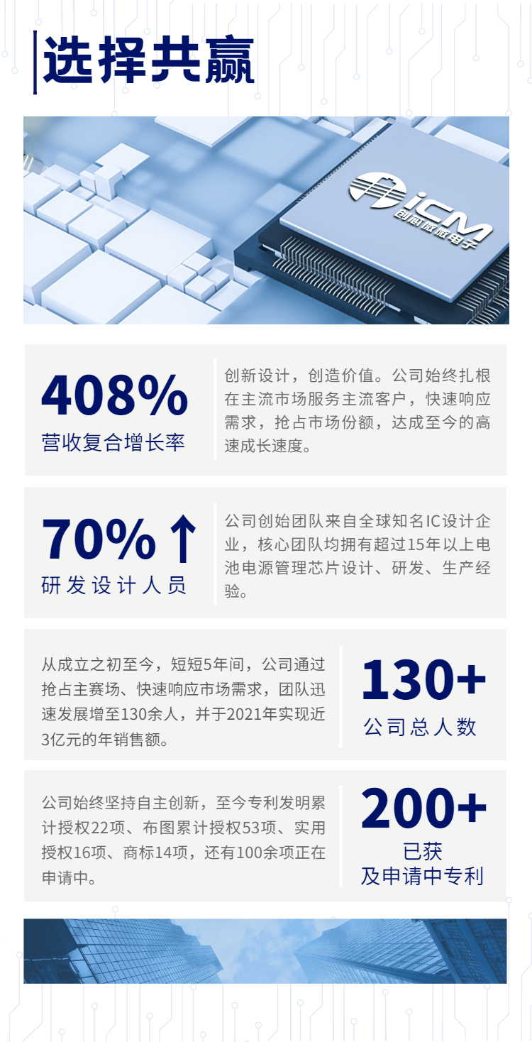 近年来创芯微以国内电池管理芯片产品线最齐全等产品优势,不仅建立了以深圳为总部和研发中心,还建立西安、珠海为研发中心、上海为研发和技术服务中心的发展格局。公司70%以上为研发技术人员,2021年产值超过2亿元,净利润超过5000万,并完成了2轮融资,总计融资金额超过2亿元。公司累计获得发明专利18项、实用新型专利15项、集成电路布图设计29项,另有超过100项各类专利在申请和审核中。