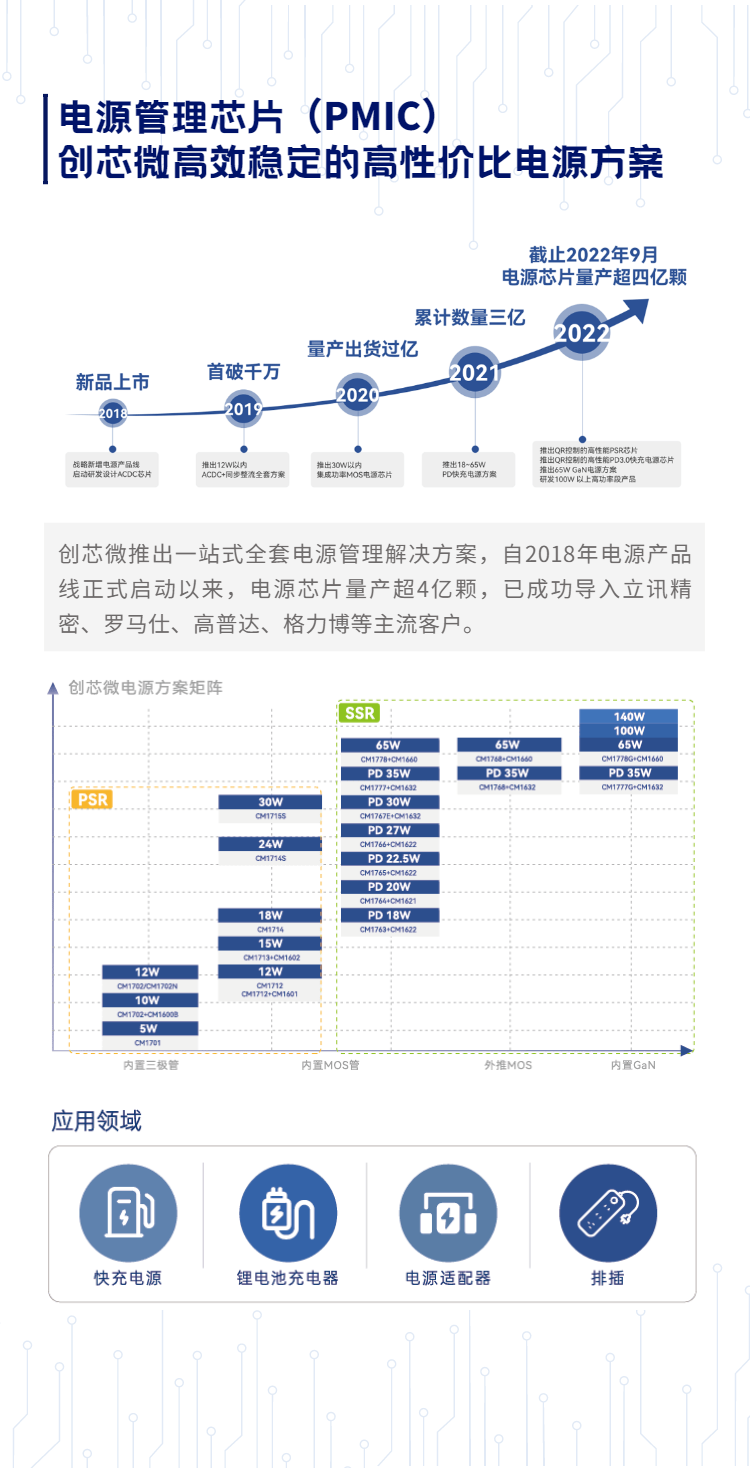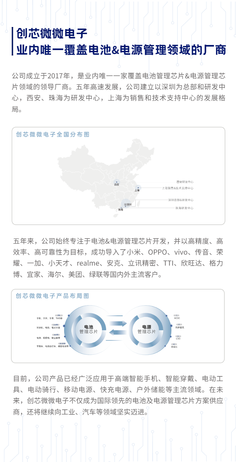 深圳市创芯微微电子有限公司(下称:创芯微)作为模拟IC芯片国产化替代的践行者之一,五年来始终始终深耕电池管理芯片(BMS)和电源管理芯片(PMIC)领域。从2017年成立至今,创芯微一直以高精度、低功耗、高效率、高可靠性为目标,与一线客户华为、小米、OPPO、vivo、传音、一加、欣旺达、安克、立讯精密、小天才、一加、realme等达成长期战略合作,并实现408%销售额增长,成为同领域国内产品线最齐全、产品功能和性能遥遥领先的领导厂商。