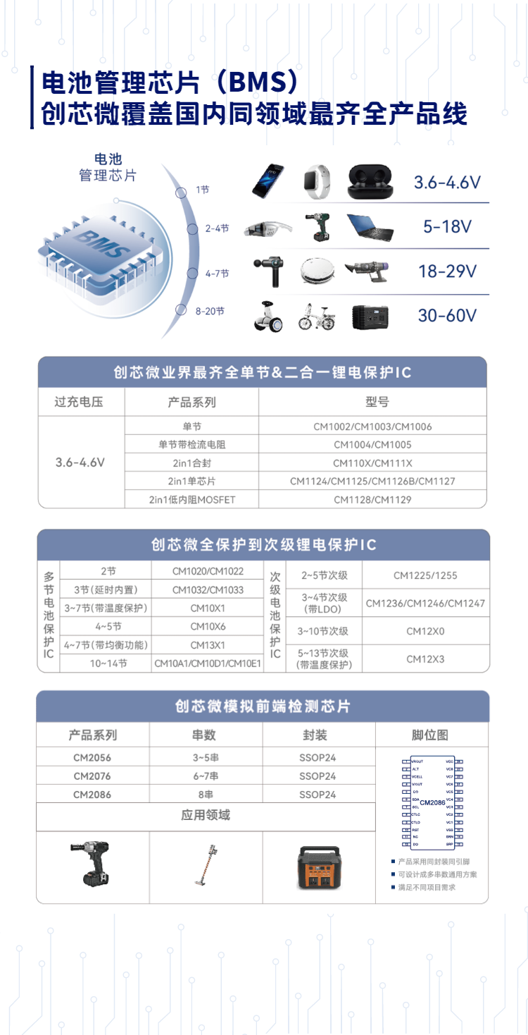 早在2017年创芯微研发出全球面积最小的单节锂电池管理芯片时,就以国产替代为目的,打破日系厂商在该领域近30年的垄断地位,随后创芯微又以旗舰产品CM1004/1005系列开创业内国产芯片打入高端智能手机应用的先河。在TWS耳机、电动工具等领域长期保持极高的占有率和客户认可度。