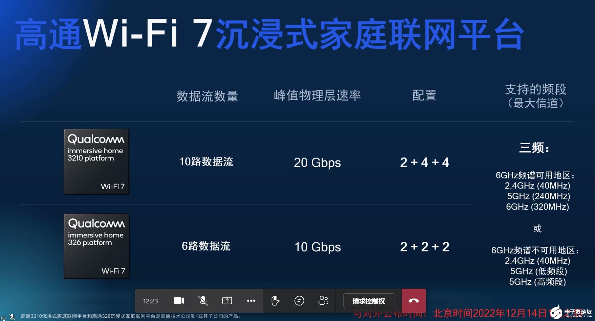 考虑到不同家庭网络对于成本要求不同,高通的Wi-Fi 7沉浸式家庭联网平台推出两款产品组合,第一款是高通326沉浸式家庭联网平台,提供入门级的Wi-Fi 7三频配置,支持6路数据流,峰值物理层速率达到10 Gbps,提供2+2+2三频配置,非常适合家庭网状路由器。第二款是高通3210沉浸式家庭联网平台,提供高性能的Wi-Fi 7三频配置,它支持10路数据流,峰值物理层速率达到了20 Gbps,满足2+4+4三频配置。