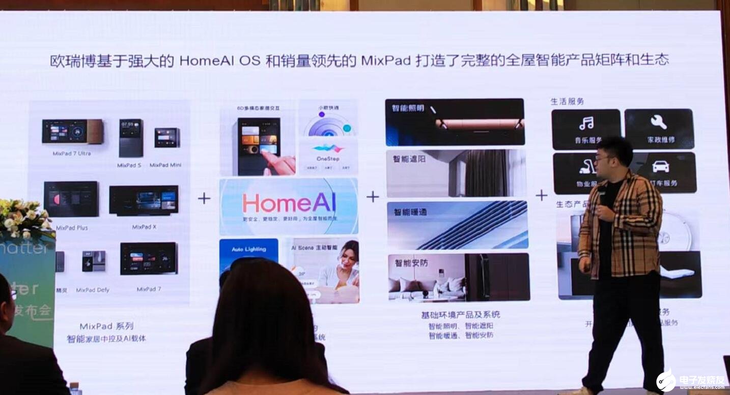 童巍指出,欧瑞博智能家居中控屏MixPad搭载了自主研发的全屋智能操作系统HomeAI OS。欧瑞博构建了以MixPad+HomeAI为基础的1+4+N全宅智能产品矩阵,为近300万个家庭实现了全宅智能。它从最开始的单品爆款,逐步走向开放合作。