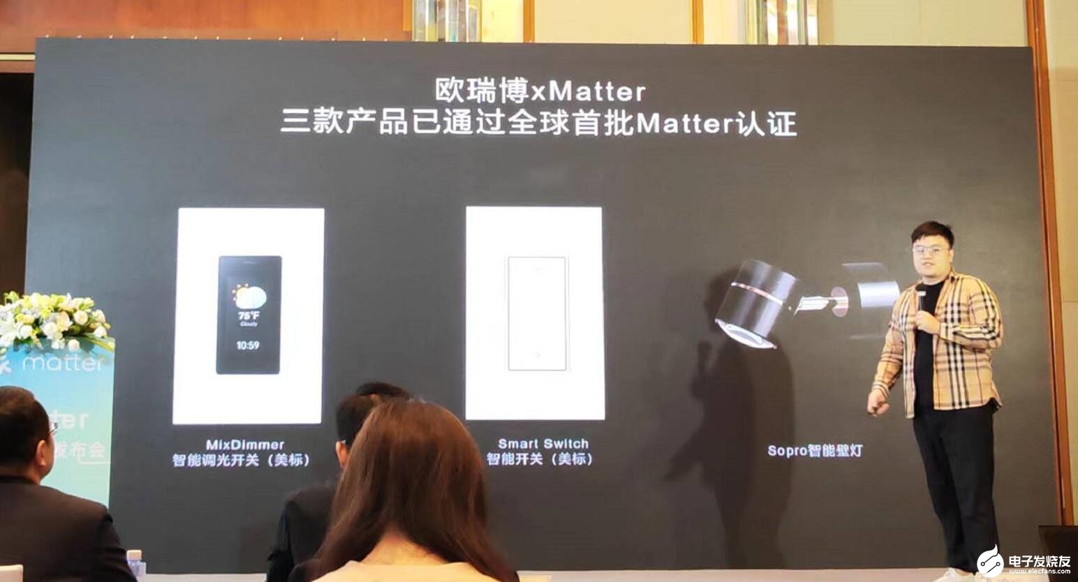 童巍介绍,欧瑞博有三款产品已通过Matter联盟全球首批产品认证,分别是MixDimmer智能调光开关、Smart Switch智能开关,以及Sopro智能壁灯。