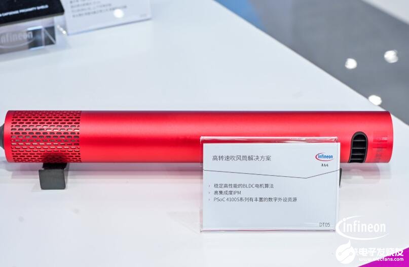 PSoC 4100S Max采用CAPSENSE™技术,拥有7x7 mm²、10x10 mm²和14x14 mm²三种封装尺寸,是工业控制、汽车人机交互(HMI)、智能家居自动化及大型家用电器的理想选择。国际电子展现场,英飞凌展示了高转速吹风筒解决方案,采用PSoC 4100S系列,具备高集成度IPM,稳定高性能的BLDC电机算法,这个系统还具备丰富的数字外设资源。