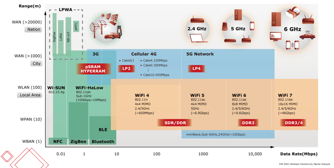 NFC、Zigbee、蓝牙、BLE,甚至Wi-SUN、WiFi-HaLow、LPWA为代表的众多短距离、低速率无线协议,目前华邦在该领域的主打方案是HYPERRAM系列。
