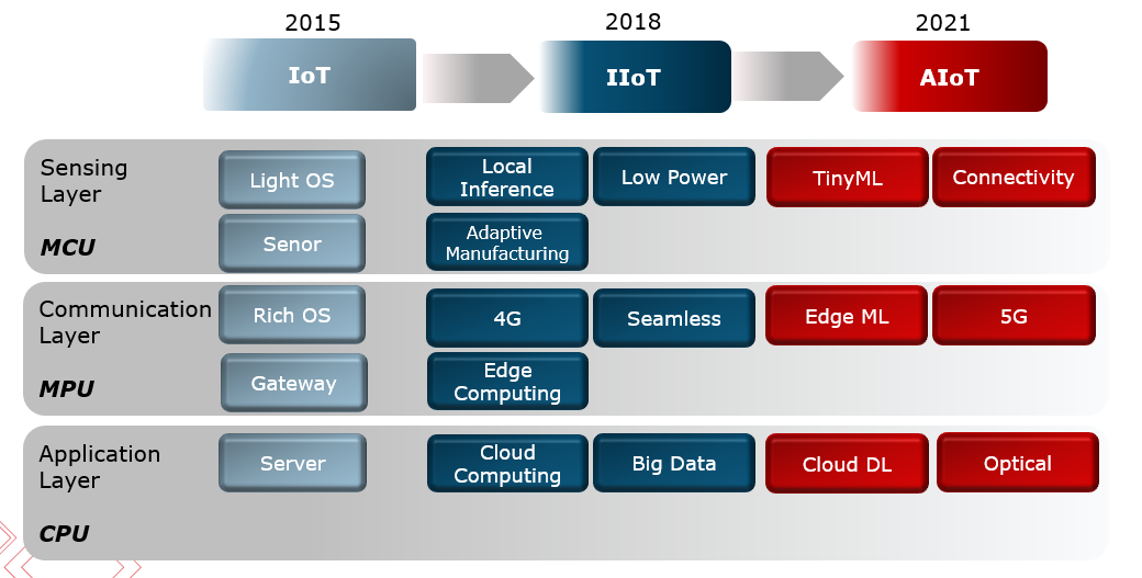 CPU/MPU/MCU产品在不同的IoT时代里所呈现的变迁。在早期的物联网时代,主要的数据都来源于各级各类传感器,信息简单,不需要太大的频宽;到了工业物联网 (IIOT) 时代,物联网终端设备开始趋于复杂,一些基本的数据决策和计算需要在本地完成,再加上4G的发展,无缝网络/全覆盖网络 (seamless network) 变得十分重要;进入AIoT时代,与传统印象中“大部分运算会在边缘服务器上或是边缘网关上进行处理”不同的是,相当分量的计算任务被放置于边缘终端上,从而对低延迟、安全隐私、边缘AI、网络连接提出了更高的要求。