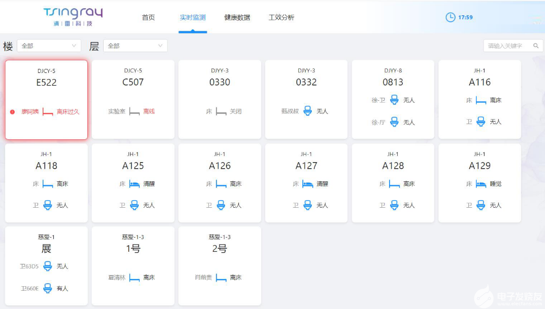 此外,贝加安®智慧养老系统还可以实现在院内大屏上展示全院老人的实时生命健康状态、意外报警情况、各项生命健康指数分析等数据,成为院端智慧养老水平的展示窗口,真正实现养老业务的数据化、可视化和智能化。
