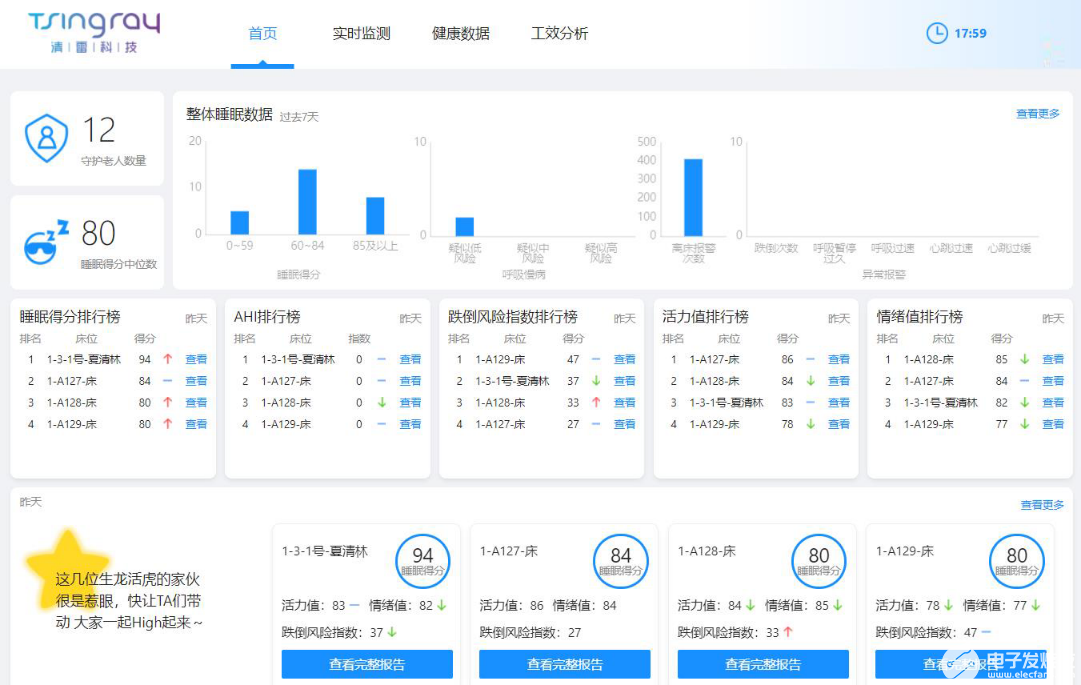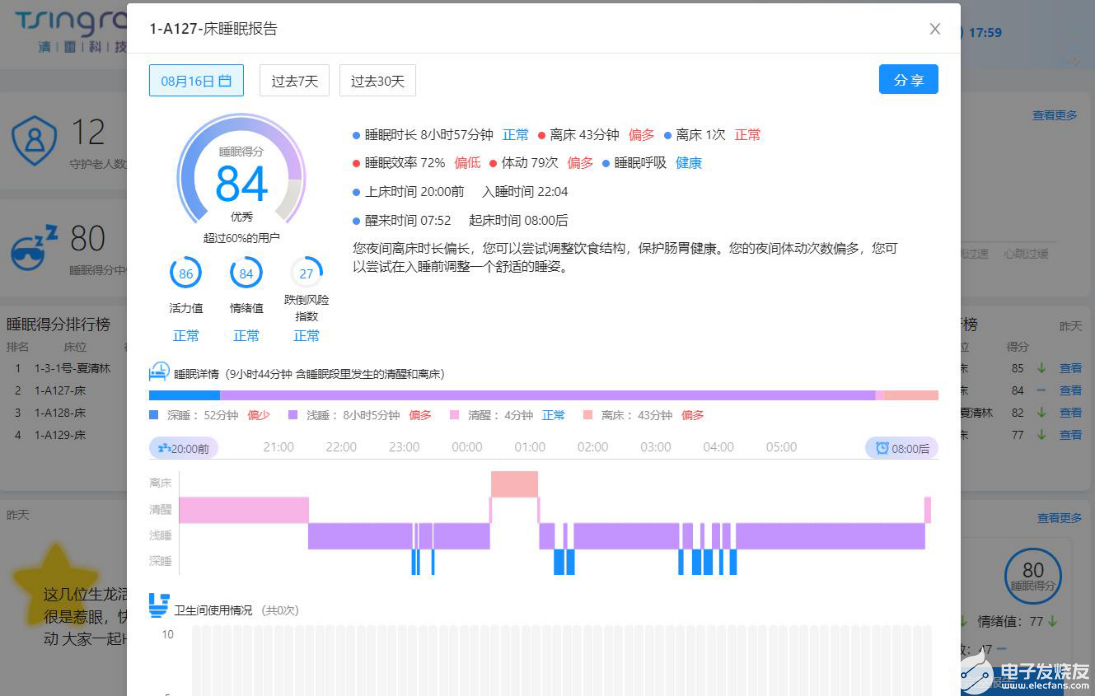 作为智能养老监测设备,除了报警功能,数据记录和数据分析功能同样必不可少。护理员电脑端和子女手机端在每天早上九点都可以收到老人前一晚的睡眠分析报告,包括睡眠时长、深浅睡眠比例、体动离床次数、呼吸暂停时长以及风险预测等数据。报告数据不仅让子女实现了亲情共享,远程了解到父母的睡眠质量,还可以为慢阻肺、哮喘咳喘等呼吸慢病患者辅助诊断治疗提供依据。