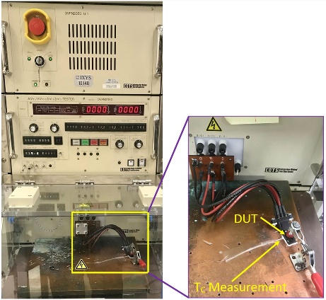 我们使用的FBSOA 测量装置包括一个生成用于测量的功率脉冲的设备、安装在铜散热器上的被测设备 (DUT) 和一个用于测量外壳温度TC的热电偶,如图 5a 所示。在两个 DUT上,使用不同脉冲宽度来测量器件可以承受的最大功率,图5b 显示了两款器件在使用各种脉冲宽度下的最大功率承受能力方面的定量比较。我们可以观察到,与竞争器件比较,Littelfuse 器件能够处理的功率明显更高,尤其是对于 ≥10ms 的长脉冲宽度和连续运行状况。这种稳健的性能可以为线性模式应用带来更高的整体系统可靠性。