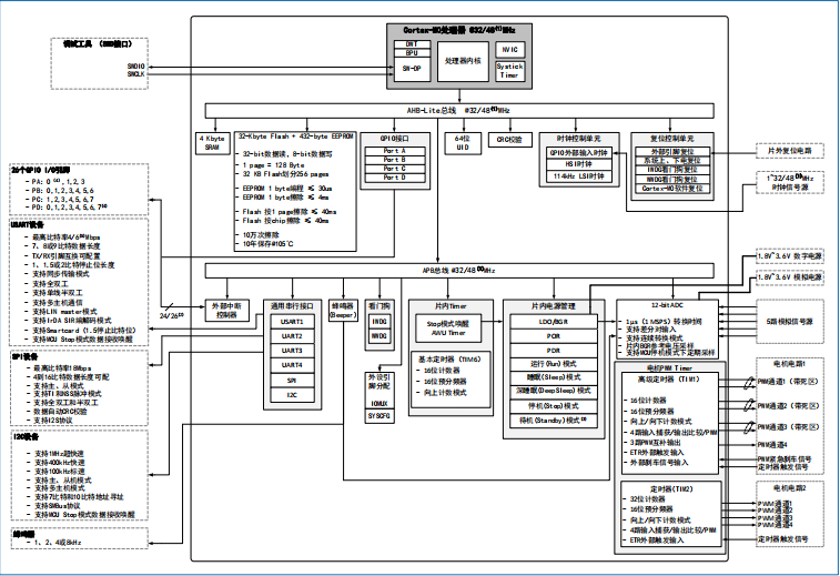 ARM® Cortex®-M0内核,最高工作频率分别为32和48MHz