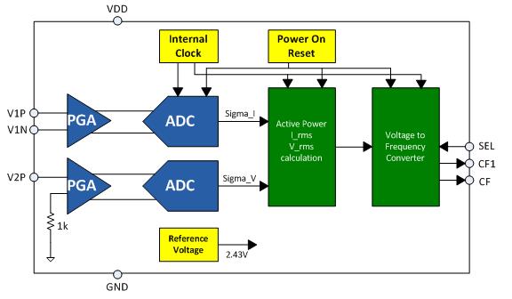 HLW8012 的V1P 和V1N 引脚输入电流信号波,电流通道集成一个固定增益放大器,允许的最大差分输入信号为±43.75mV;电压通道允许的最大输入信号是±700mV。 HLW8012 可以使用低成本的锰铜采样电阻或电流互感器来测量电流,并使用分压电阻或电压互感器来测量电压,其芯片的脉冲输出频率与有功能量成正比。