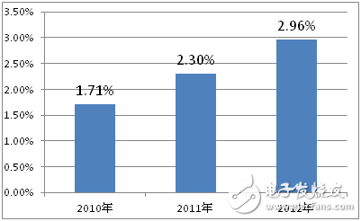 该现状的出现,直接促进了国内智能家居行业在2012年阶段的强力发展。据国际物促会(IIPA)的市场调研数据显示,2012年中国智能家居系统在新房市场的渗透率已经达到2.96%,较2010年的1.71%增加了1.25个百分点。