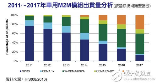 车厂采用长程演进计划(LTE)机器对机器(M2M)模组的比重将快速攀升。随着车用M2M模组价格持续下滑,越来越多车厂开始将原本2G M2M模组升级至WCDMA和HSPA等3G模组,甚至直接导入LTE方案,以满足联网汽车对频宽日益高涨的需求。IHS预估,未来4年车用LTE模组的出货量成长将极为强劲,其占整体车用M2M模组出货量的比重,可望从2013年不到1%,跃升至2017年的30%。