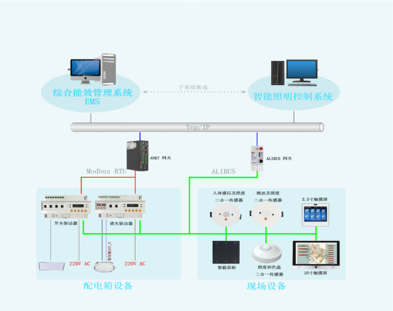 以综合大楼为例,采用安科瑞的ALIBUS智能照明控制系统,对大堂、会议室、楼梯间、公共走廊、电梯厅等地均采用了智能照明控制。大厦的智能照明控制系统拓扑图如下图所示。