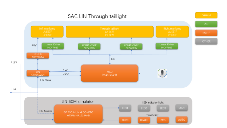 本方案的A、B灯采用独立的LED驱动,符合实车设计要求。A、B灯之间使用LIN命令进行同步,实现流水转向及动画的平滑衔接。使用自带触摸按键功能的LIN SiP MCU实现LIN BCM仿真,用于控制演示尾灯的各项功能。此外,音乐律动功能让LED跟随音乐节奏而跳动,虽然方案只做了红光和黄光设计,但用户可基于此方式,自行添加其它颜色光。如果使用RGB LED,还可以用它来开发车内音乐氛围灯。