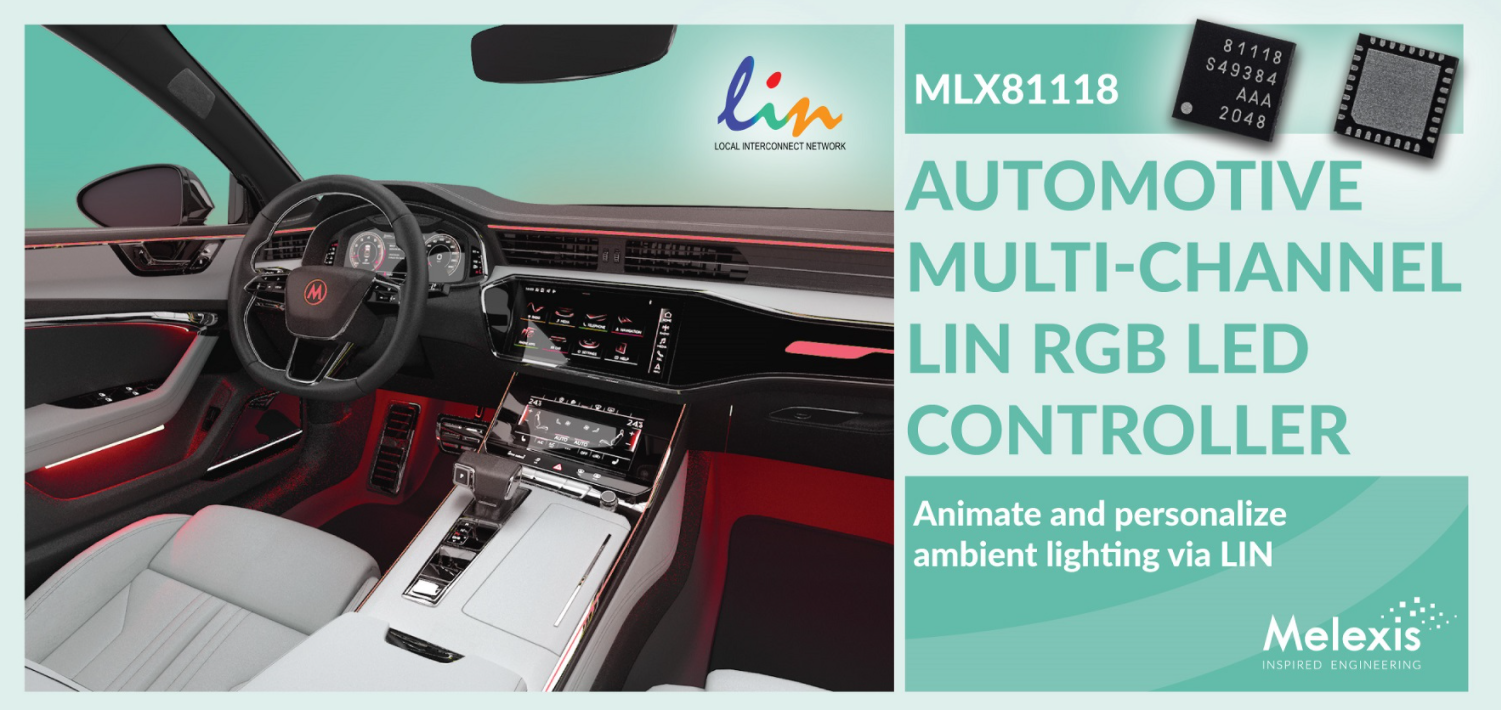 通过推出面向 LIN 生态系统中的车内氛围灯照明和动态照明应用的多通道 LIN RGB LED 控制器芯片 MLX81118,Melexis 进一步扩展了该产品系列。MLX81118 具有 24 路输出(每路输出可提供高达 60mA 的电流),可驱动八颗 RGB 通道。独立的 PWM 控制与高达 16 位的分辨率配置使得这款控制器能够实现任何色点和亮度。