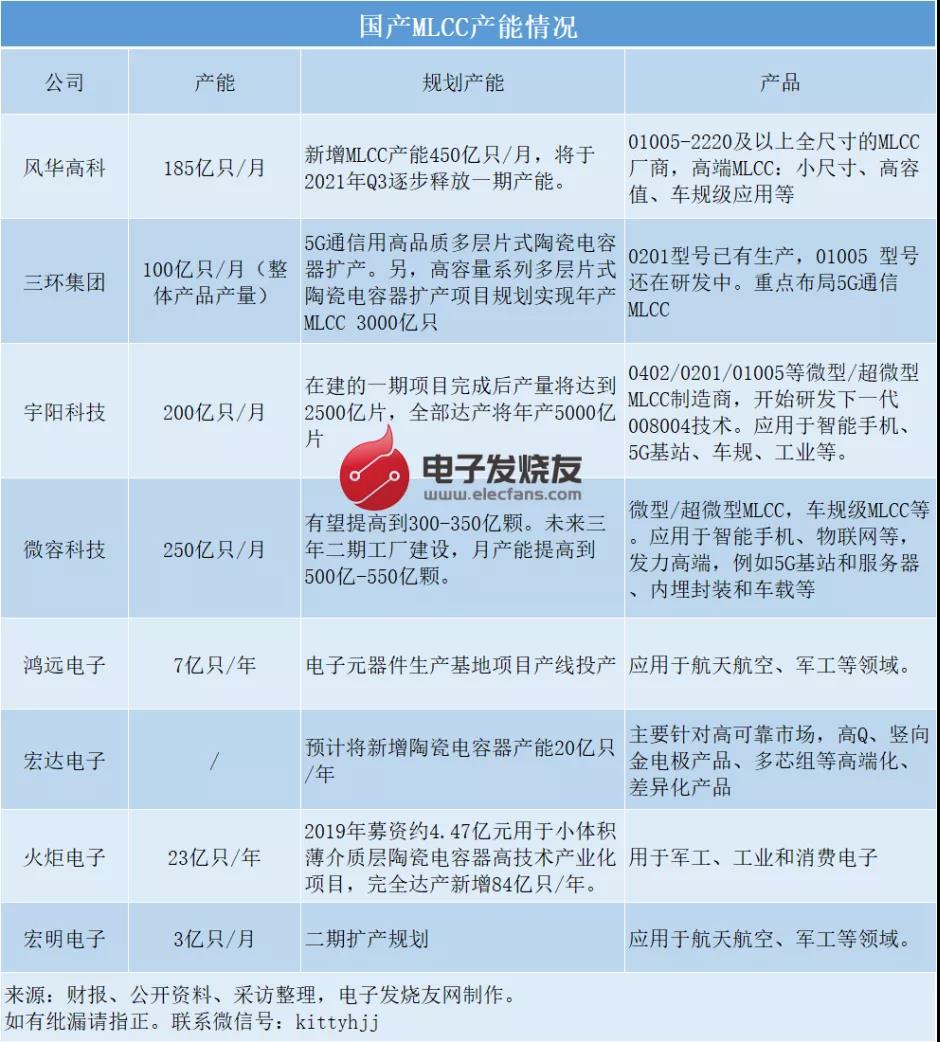 据电子发烧友网记者的统计,当前国产MLCC厂商的产能情况如下: