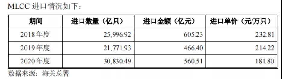 根据海关总署MLCC进口情况,以2018至2020年每年平均进口数量2.6万亿只测算,若替代50%,国产替代市场规模高达1.3万亿只。