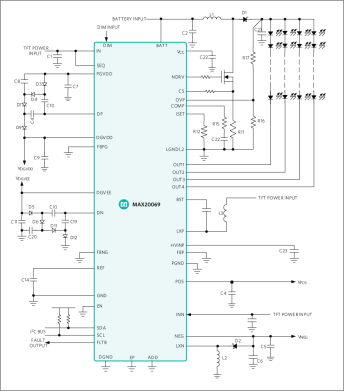 栅极驱动电源,以及为四串LED显示屏背光供电的升压压感式转换器。MAX20069的源级驱动电源,可产生-7V至+18V的电压,并且,正压源极