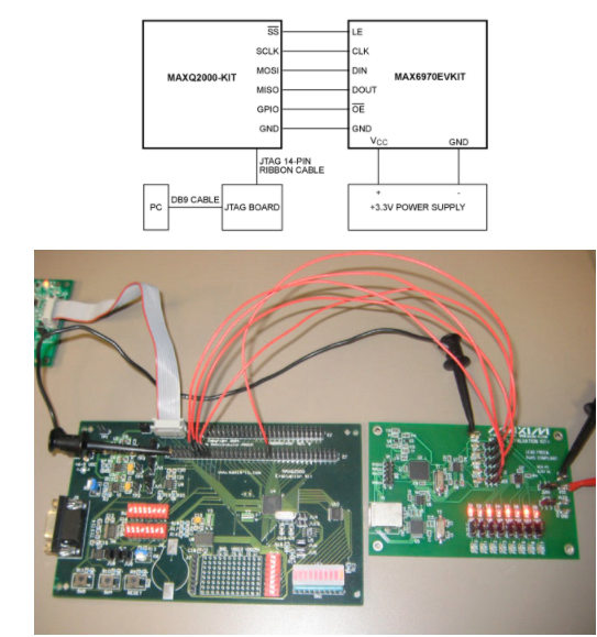 从跳线 JU1–JU5 上拆下分流器。通过将MAX6970评估板的JU1–JU5(对应于DIN、CLK、LE、DOUT和低电平有效OE)的引脚2连接到MAXQ2000评估板来配置系统(图2)。将跳线 JU14 上的分流器移至 2-3 位置,并向 MAX6970 评估板的 VCC 焊盘施加 3.3V 电源。在打开电源之前,确保MAXQ2000和MAX6970评估板的地连接在一起。MAX6970 评估板的所有其他跳线应保持在其默认位置 1–2。图3显示了MAXQ2000和MAX6970评估板之间的实际设置。