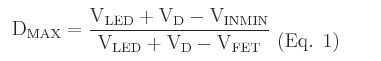 其中 VLED 是 LED 串的正向电压,单位为伏特,VD 是整流二极管的正向压降(大约 0.6V),VINMIN 是最小输入电源电压,单位为伏特,VFET 是平均漏源电压开关 MOSFET 导通时的电压(以伏特为单位)(初始假设为 0.2V)。