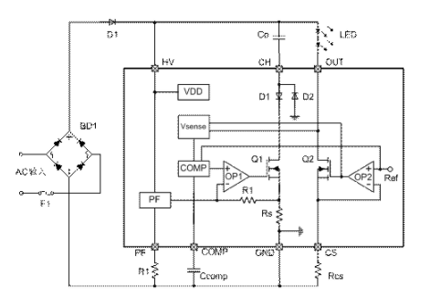 在交流电压的谷底期间,输入电压会低于LED导通电压,因此需要一个储能电容Co来维持LED的输出。在常规的应用中,Co的驱动(Q1,OP1)是一个固定的充电控制,峰值电流外部设定后就已经固定,考虑到高效的实现再加入一个过压降电流的控制,降电流幅度一般也是外部电阻来设定。但是这样会带来一个问题,一旦外部设定好后充电电流就被固定,无法根据输入电压及输出负载的变化做动态调整,只能被动的输入电压高于LED电压后导通,因此会带来两种后果,一是如果充电电流过多会导致Co放电时Q2的输入电压过高,从而Q2损耗增加,效率下降;另一个就是如果充电电流偏少导致Co放电过低,LED输出无法维持恒流,从而出现工频闪烁。