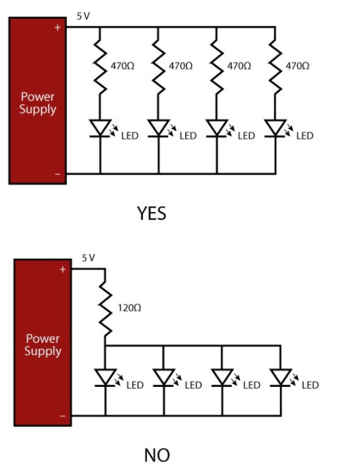 LED绝不能直接并联连接,因为它们将不会平均分担电流。相反,应在每个LED上串联一个电阻,以设置每个单独LED中的每个电流。