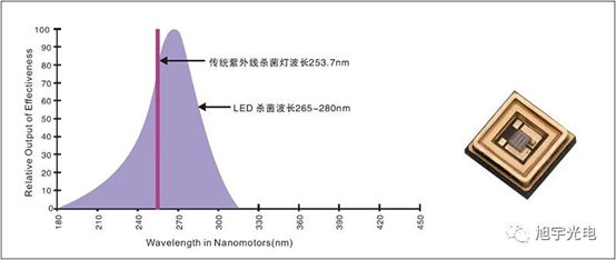 图5 传统杀菌灯与UVC LED有效波长对比及LED封装形态图