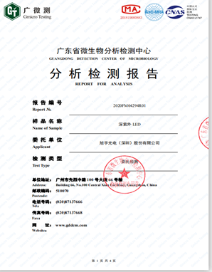 据旭宇光电介绍,该产品采用进口UVC LED芯片、超导热氮化铝陶瓷基板搭配高可靠性共晶焊技术,并采用静电保护结构,有效地解决UVC LED芯片容易被静电击穿的缺陷,透镜和基板无缝结合,隔绝外界水汽和污染物的进入。经过广微测的认证,旭宇光电UVC产品对常见的致病细菌病毒均达到99.999%的消杀效果。