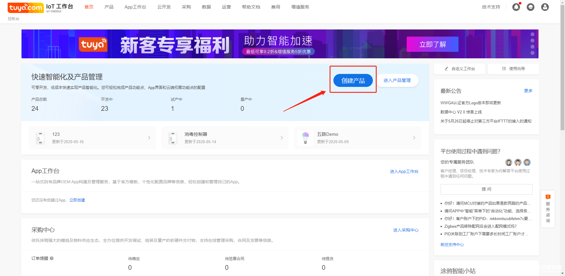 请登录开发者平台iot.tuya.com。若没有注册,请先注册。若已经注册,请直接登录。