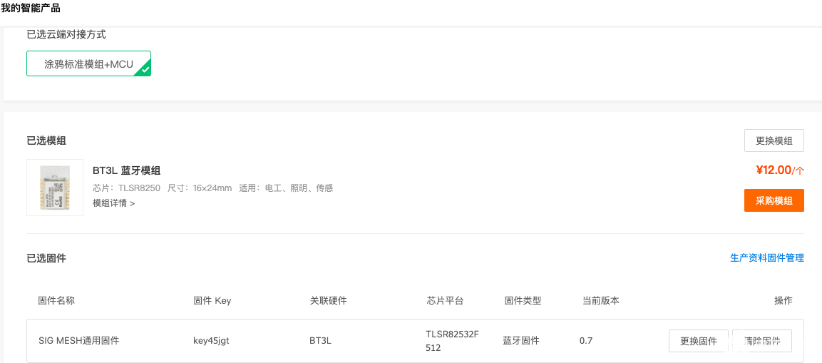 根据产品的类型、形态、结构特点选择合适的模块,点击“详情”可以查阅模块规格书。 选择模块后进行固件信息配置,固件配置决定了产品的功能表现,这部分功能会在模块生产时进行烧录,出厂后无法OTA升级修改请结合需求仔细配置。配置详情请参考[固件信息配置说明]