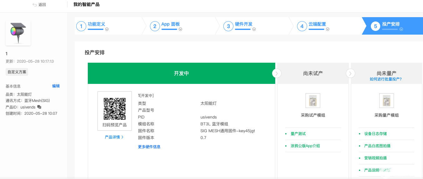 试产完成并测试通过后点击“测试通过开始量产”,配置参数将进入不可修改状态,避免误操作对使用该产品的消费者造成不必要的影响。请不要随意删除开发中或开发完成的产品,避免造成数据丢失,消费者无法正常使用。