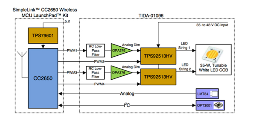 对于 LED 产生不同级别输出的功能,其使用需要一个集成式解决方案。其中一种产品是具有集成模拟电流调节的 TPS92513/HV 1.5 A 降压型 LED 驱动器 — 参考设计中的主要元器件之一。当与 SimpleLink CC2650 多标准 MCU 结合使用时,它可为开发从稳压 DC 电源运行的智能 LED 照明系统提供完美的平台。在设计中加入其他元器件后就形成了完整的原理图,如下所述。
