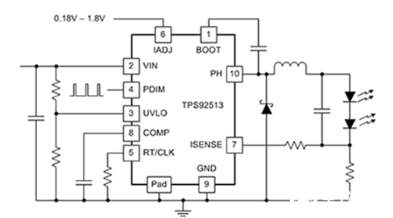 TPS92513/HV LED 驱动器专为一系列高功率照明应用(包括街灯、应急照明以及工业和零售照明)而开发,但同样适用于小型家电。除了为模拟和 PWM 控制信号提供输入外,它还具有集成的 N 通道高压侧 MOSFET。图 2 显示了如何使用该器件的简化原理图。