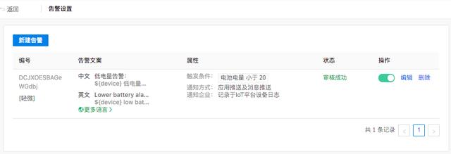 按所需产品所需进行配置,如温度高于多少,湿度低于多少,电量低于多少报警,具体案例如“低电量告警”如下