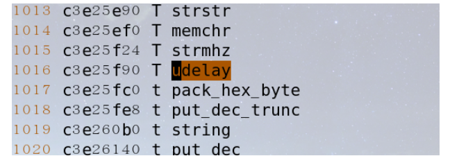 上面程序总用到的延时函数udelay(),由于U-Boot作为嵌入式Linux系统的引导,不具有标准C库中的内容。要使用像printf函数,延时函数udelay(),就需要u-boot中提供的。u-boot函数内容在u-boot源码文件中就需要u-boot中提供的。u-boot函数内容在u-boot源码文件中的System.map文件中。System.map文件是被内核所使用的符号表。符号表是一个在符号名称与它们的存储器位置间的查询表格。符号名称可能是变量的名称或是函数名称。当要查询符号名称的位置或是特定位置的符号名称时,就会需要System.map。找到函数的对应地址,就可以对它进行使用了;