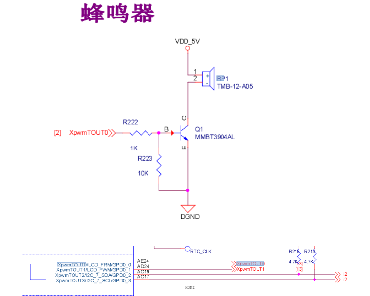 通过查看底板手册可知,当XpwmTOUT0处于高电平是蜂鸣器就会响起;通过XpwmTOUT0我们在核心板上找到它的引脚