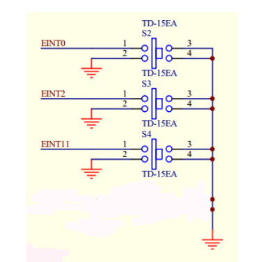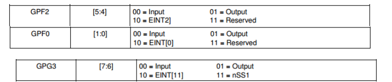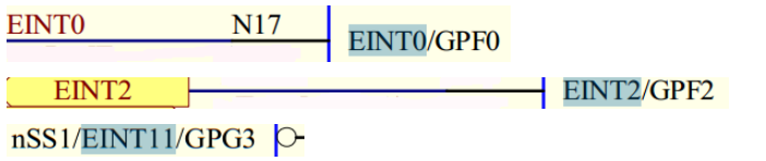 通过查找EINT0,EINT2,EINT11对应的引脚,发现它们分别对应GPF0,GPF2,GPG3,如图: