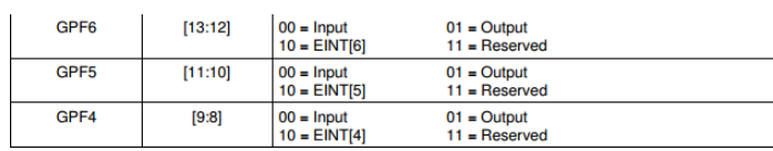 GPFCON &= ~(GPF4_msk | GPF5_msk | GPF6_msk);