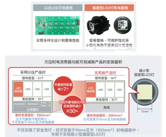 LED驱动器BD18336NUF-M在1枚芯片中内置了欠压时电流旁路功能,与需要比较器和晶体管等部件的以往产品相比,相应的电路可减少7个外置部件,包括外置电路在内的安装面积可减少约30%。这样,10mm见方的LED模块电路板中也可以安装本产品,因此可实现近年来需求的超小型的插座型LED灯。