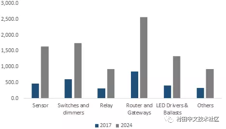 在产品市场中,预计灯具在预测期内将呈现最快的采用率;而由于智能灯泡和灯具技术的快速发展,最终将在2024年占据智能照明市场主要份额。由于各公司以极具竞争力的价格提供各种创新型智能灯泡和灯具,预计这些灯具装置将在2018至2024年间迅速增加。
