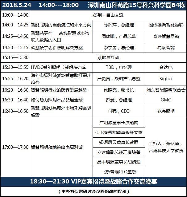 目前计划邀请的VIP嘉宾包括:Silicon Labs IOT策略高级销售经理刘俊、英飞凌照明市场营销总监Edward Zhang、微软中国区首席技术顾问管震、阿里云TBD、晶丰明源董事长胡黎强、中电科50所营销总监姚永强、蚂蚁雄兵智能物联总经理陈辉萍、亿思腾达总经理王晓文、易联智能总经理李学勇、***科技大学教授萧弘清、奇迹智慧网络产品总监周瑞鹏、兆亮照明CEO付强、GMC深圳总经理罗曼、飞乐音响研发总经理童敏、广明源光电董事长洪燕南、方大智控董事长宋宏伟、立达信副总经理唐琼善、上海浦东智能照明联合会等。