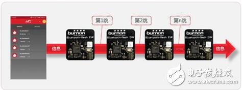 该方案可演示多组灯光控制,或多达50个节点同时受控制,或点对点控制的多种场景。方案还可演示蓝牙Mesh网络中继功能,即通过传递信息,使并不在发送信息的节点的RF信号范围内的节点也能正常接收到信息,如下图所示。方案同时支持模块自由拆装,电源独立控制,方便客户前期预研和测试。