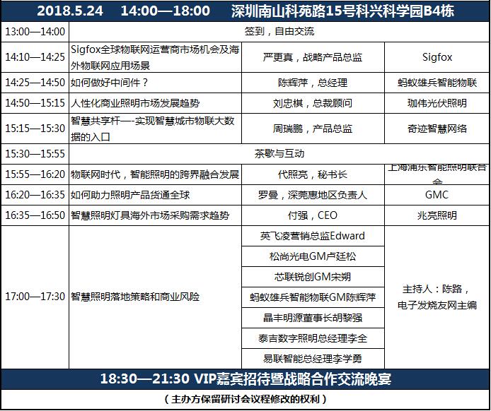 7G智慧网络产品总监将于下午15:00上台发言,分享智慧路灯解决方案,对此感兴趣的工程师和厂家请注意时间,不要错过精彩内容,以下是智慧照明高峰论坛的议程: