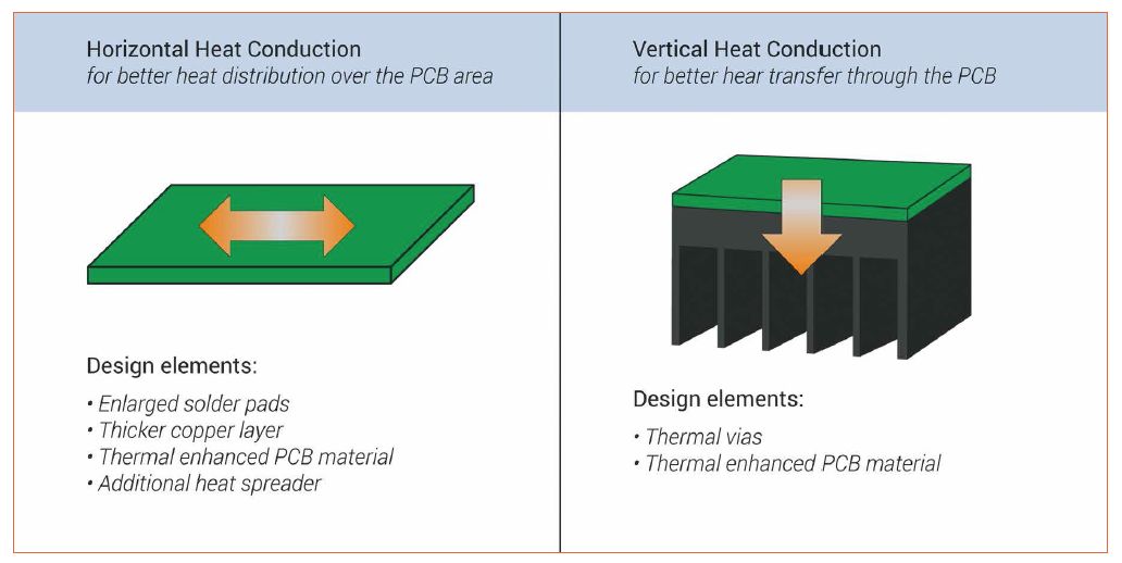 PCB的散热设计为设计人员提供了另一系列决策(图4)。热量可以通过PCB(水平传导)或通过PCB(垂直传导)传输。