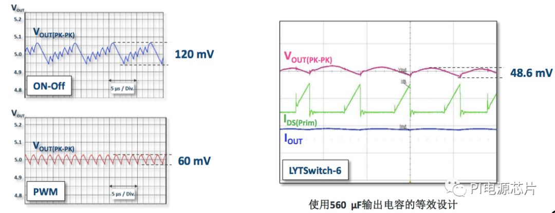 【图5,与传统环路控制方案相比,LYTSwitch-6可以获得更低的输出纹波】